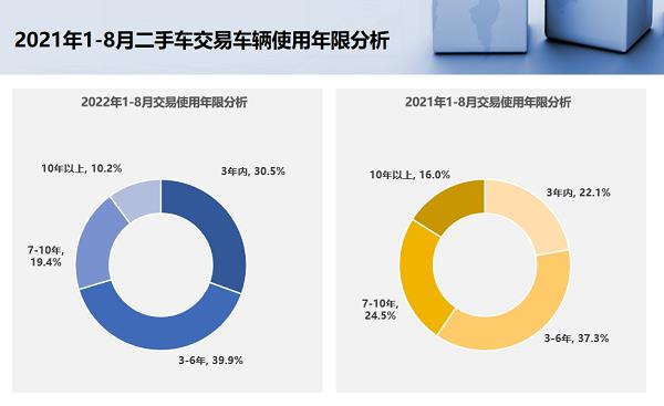 值得注意的是,我国二手车交易年限有明显缩短趋势。今年前8月,3年内车龄交易占比为30.5%,同比增加8.4%;3-6年车龄占比为39.9%,同比增加2.5%;7-10年车龄占比为19.4%,同比减少5%;10年以上车龄占比10.2%,同比减少5.9%。新能源细分市场更是如此,整体来看,8月新能源二手车车龄较7月份有所下降,2年以内的车型占比增长明显。(中国经济网 记者陈梦宇)