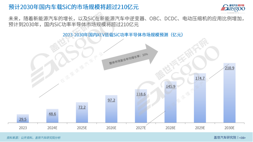 根据乘用车市场信息联席会发布的数据,7月,国内新能源乘用车市场单月零售渗透率首次超过了50%。另结合车能传媒研究院数据,未来,随着新能源汽车的增长,以及SiC在新能源汽车中逆变器、OBC、DCDC、电动压缩机的应用比例增加,预计到2030年,国内SiC功率半导体市场规模将超过210亿元。