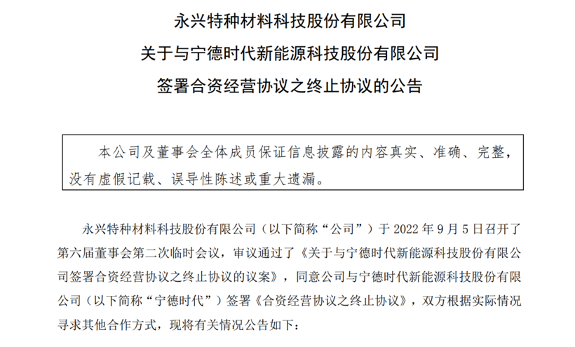 相关公告显示,因项目筹建过程中实际出现和面临的新情况,永兴材料董事会同意与宁德时代签署《合资经营协议之终止协议》,双方将根据实际情况寻求其他合作方式。