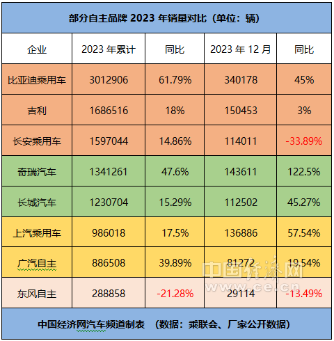 中国经济网记者通过梳理厂家公开的数据和乘联会发布的数据发现,2023年比亚迪乘用车、吉利、长安乘用车、奇瑞、长城、上汽乘用车、广汽自主和东风自主(含东风柳汽、东风乘用车、岚图汽车和猛士科技)的累计销量分别为3012906辆、1686516辆、1597044辆、1341261辆、1230704辆、986018辆、886508辆、288858辆,同比分别增长61.79%、18%、14.86%、47.6%、15.29%、17.5%、39.89%、-21.28%;去年12月的单月销量分别为340178辆、150453辆、114011辆、143611辆、112502辆、136886辆、81272辆、29114辆,同比分别增长45%、3%、-33.89%、122.5%、45.27%、57.54%、19.54%、-13.49%。