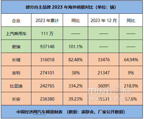 作为新崛起的自主出海“四强”,长城、吉利、比亚迪、长安在2023年保持齐头并进的态势。数据显示,2023年,4家企业在海外的累计销量分别为316018辆、274101辆、242765辆、236380辆,同比分别增长82.48%、38%、334.2%、39.23%;去年12月的单月销量分别为33476辆、21347辆、36095辆、15531辆,同比分别增长64.94%、9%、218.9%、57.6%。