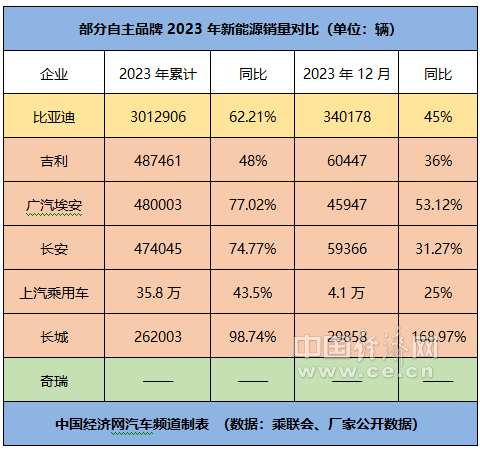 在奇瑞蓄势待发之际,比亚迪乘用车、吉利、广汽埃安、长安、上汽乘用车、长城等自主品牌已经在收获新能源汽车市场的红利。具体来看,2023年,6家企业新能源汽车的累计销量分别为3012906辆、487461辆、480003辆、474045辆、35.8万辆、262003辆,同比分别增长62.21%、48%、77.02%、74.77%、43.5%、98.74%;去年12月的单月销量分别为340178辆、60447辆、45947辆、59366辆、4.1万辆、29858辆,同比分别增长45%、36%、53.12%、31.27%、25%、168.97%。