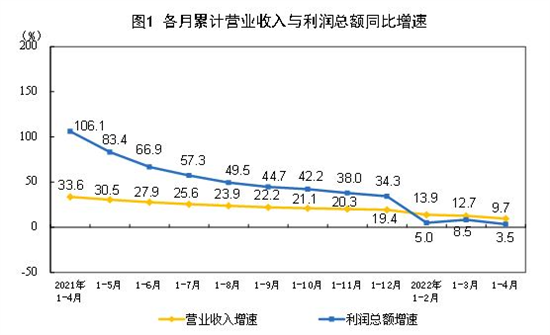 今日,国家统计局发布数据,1-4月,全国规模以上工业企业实现利润总额26582.3亿元,同比增长3.5%,增速较1-3月回落5.0个百分点。